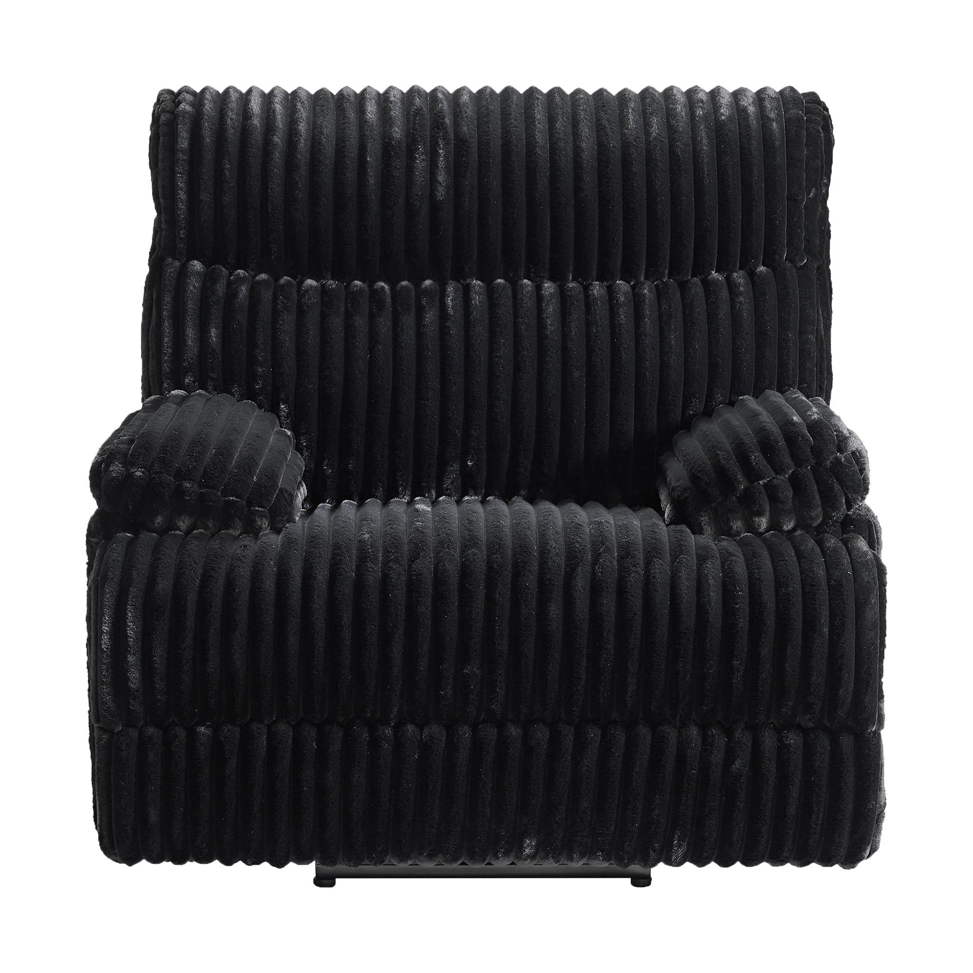 Let the Admiral Motion Recliner in Masis Black cradle you in unprecedented comfort. Upholstered in a plush, ribbed fabric and filled with supportive cushioning, this piece is made to enrich even your longest moments of repose. Manual reclining functionality enhances relaxation, while padded pillow top armrests are ideal for lounging. The versatile and sleek black finish pairs well with various décor styles and is forgiving to staining, while framing of quality engineered wood enhances durability. For a piece as versatile as it is comfortable, outfit your living space with the Admiral Motion Recliner in Masis Black.