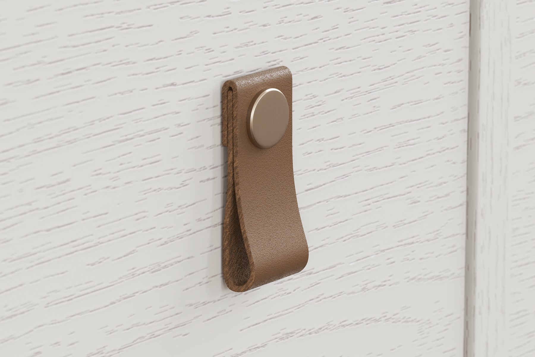 Dare to take minimalism to the max. This dresser has an air of sleek simplicity thanks to its white painted finish with subtle replicated wood grain. The magnificently mod splay legs are a compelling complement to its streamlined design. And with two sets of faux leather drawer pulls that allow you to customize the dresser to suit your space, there's no doubt about it: This contemporary piece is sure to become a classic.