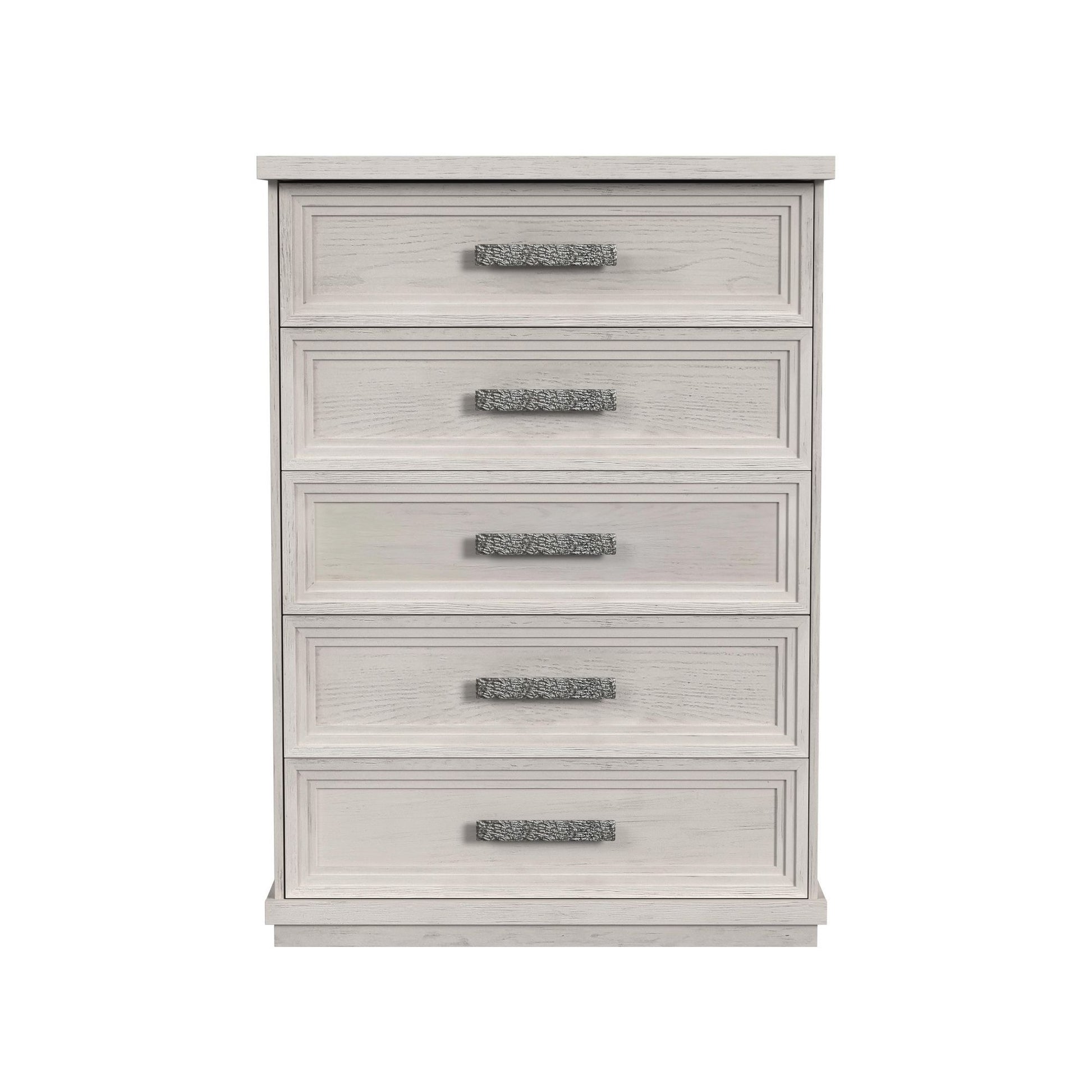 The Avalanche 5-Drawer Chest enhances your bedroom with the versatile appeal of transitional style. Its antique white finish radiates warmth and charm, creating an inviting atmosphere that complements any décor. The drawer fronts feature an elegantly paneled design that adds depth and visual interest, while the distinctive metal pulls with nail-hammered texture provide a striking contrast. With five spacious drawers, the dresser offers ample storage for clothing and bedroom essentials making the Avalanche 5-Drawer Chest a stylish and practical addition to your bedroom.