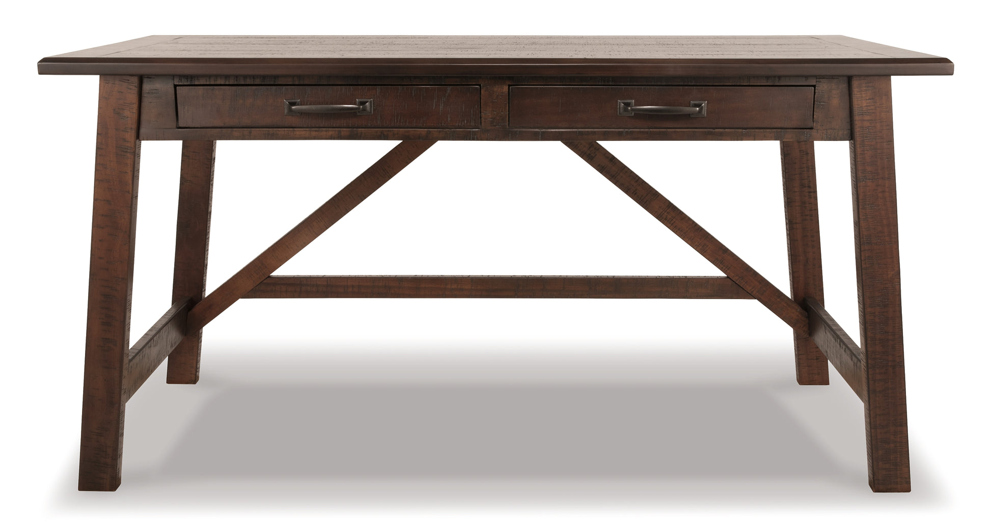 Leaning toward a casually cool look with a touch of rustic industrial flair? This home office desk with canted legs takes a fresh stance on style. Two smooth-gliding drawers with dovetail construction reflect high quality that never goes out of fashion. Saw marks infuse a touch of rich distressing. Antiqued sculptural pulls provide the finishing touch.