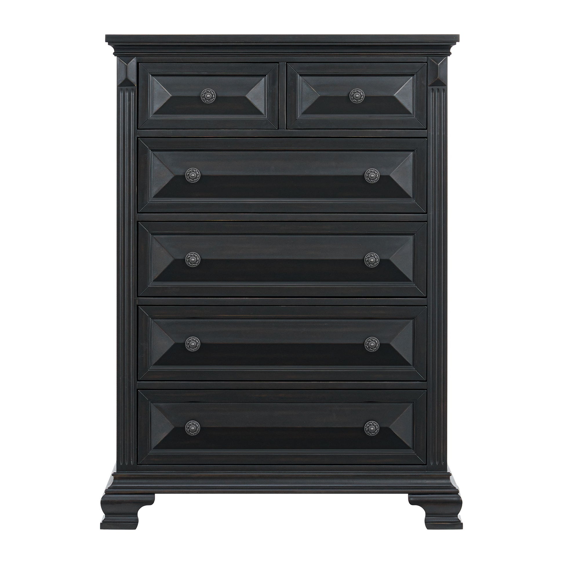 The Bridgestone 6-Drawer Chest is the perfect addition to any bedroom. This case piece is designed with beautiful beveled design throughout, adding a touch of elegance to your decor. The finish features faint distressing for a unique look, while the metal knob hardware adds a contrasting touch. The top drawers are lined with felt to protect delicate items, while the bottom drawer features cedar veneer for added durability. With ball bearing drawer guides and an anti-tipping kit included, this chest is as functional as it is stylish. Bring sophistication and organization to your bedroom with this piece from the Bridgestone collection.