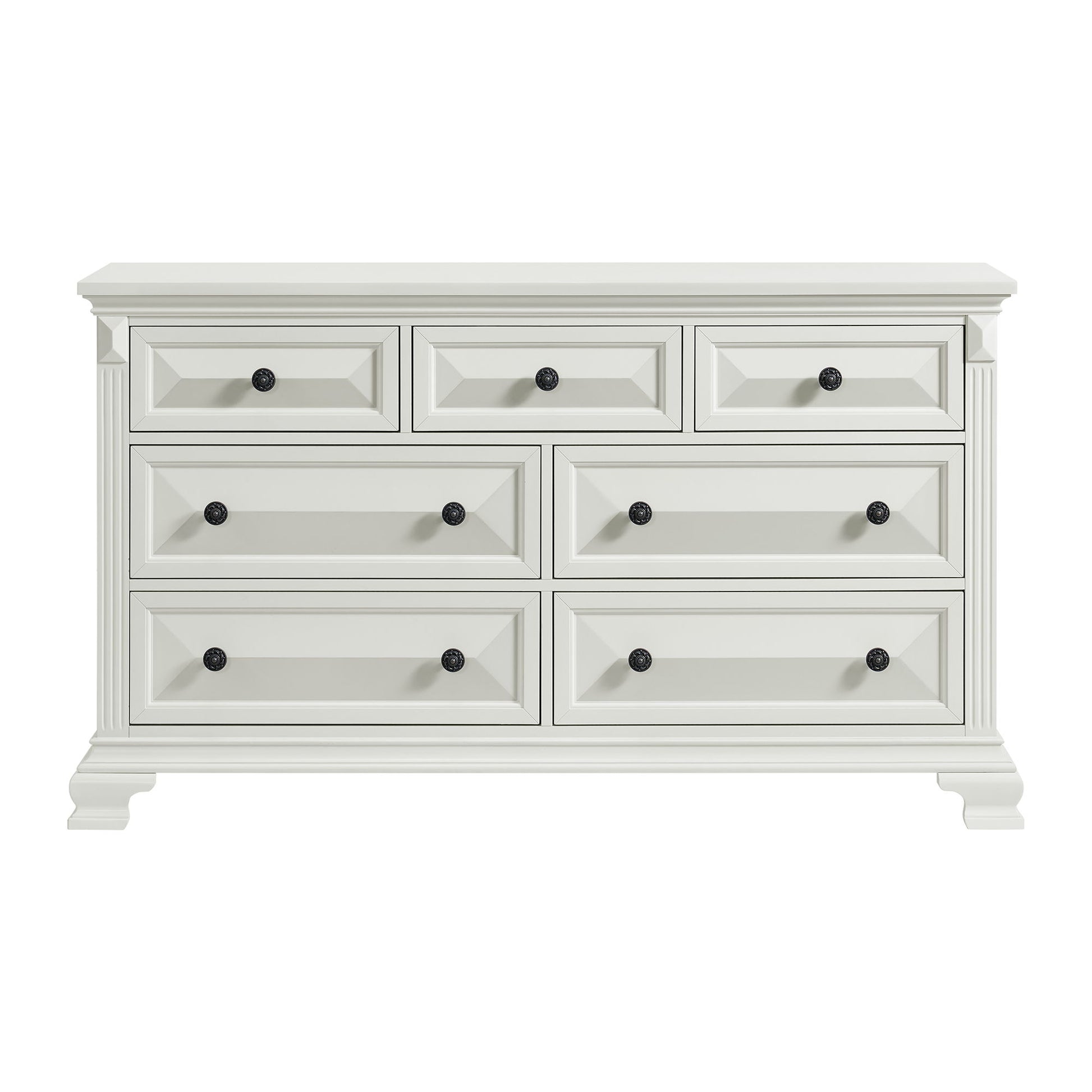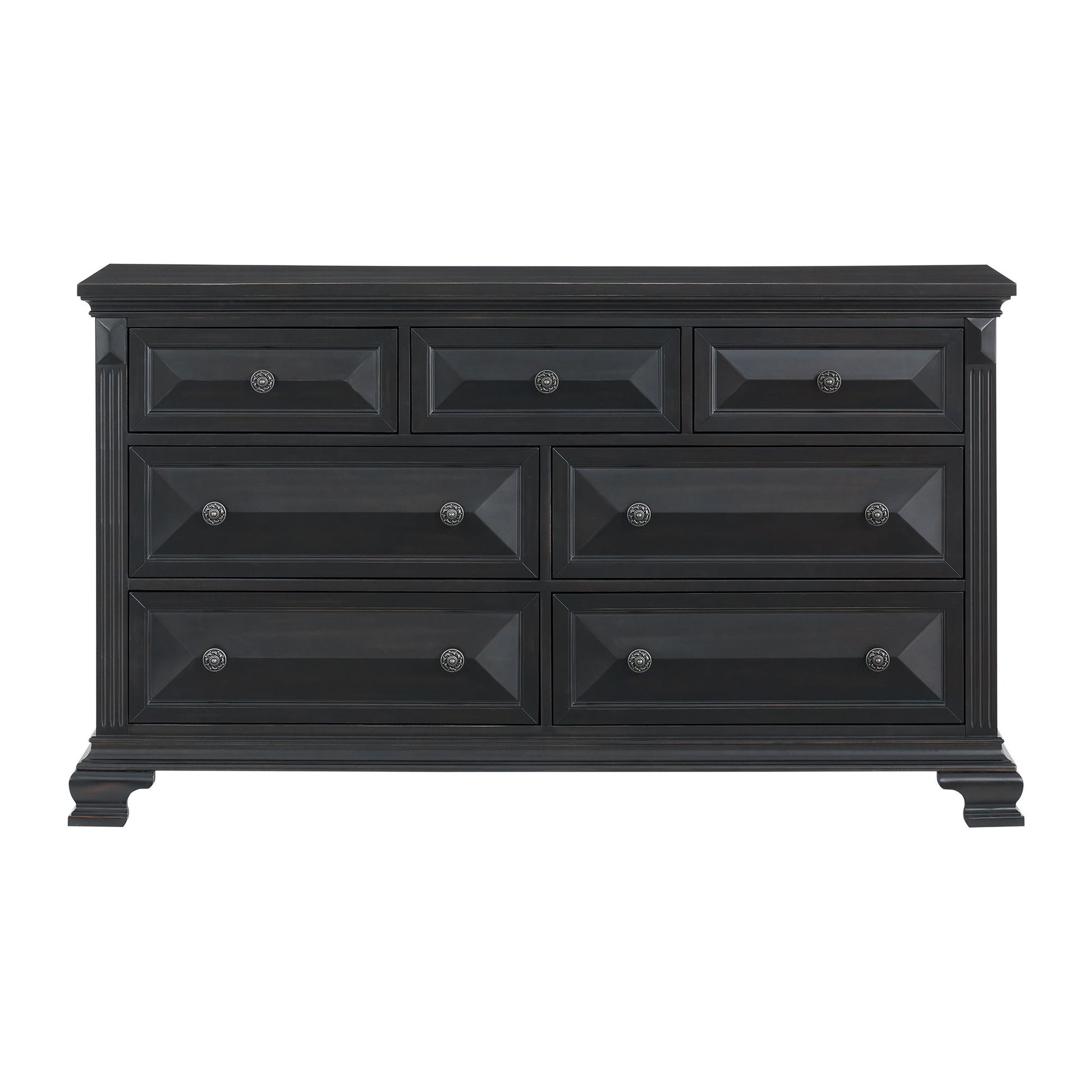 The Bridgestone 7-Drawer Dresser is the perfect addition to any bedroom. This case piece is designed with beautiful beveled design throughout, adding a touch of elegance to your decor. The finish features faint distressing for a unique look, while the metal knob hardware adds a contrasting touch. The top drawers are lined with felt to protect delicate items, while the bottom drawers feature cedar veneer for added durability. With ball bearing drawer guides and an anti-tipping kit included, this dresser is as functional as it is stylish. Bring sophistication and organization to your bedroom with this piece from the Bridgestone collection.