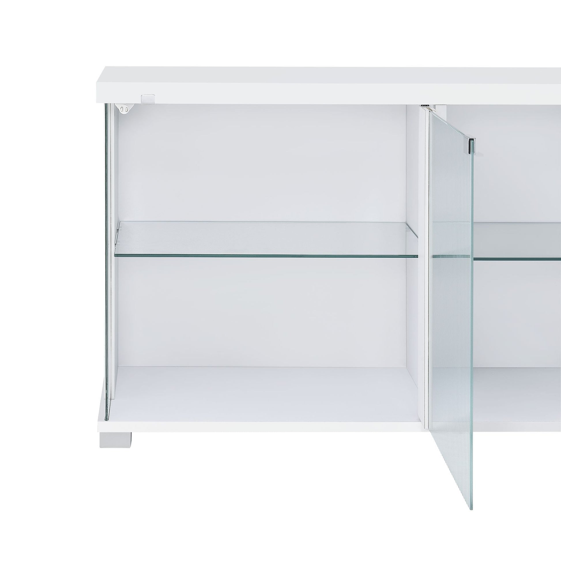 The Chandra 70" TV Stand in a glossy white finish is the perfect addition to any modern living room. The stand features RGB LED lights that can be adjusted to create the perfect ambiance for any occasion. Two translucent cabinets provide ample storage space for media accessories, while open glass shelving allows you to display decorative items or store devices. This sleek and contemporary TV stand not only enhances the aesthetic of your space, but also provides functionality and organization for all your entertainment needs. The Chandra TV Stand is the perfect way to elevate the ambiance of your home.