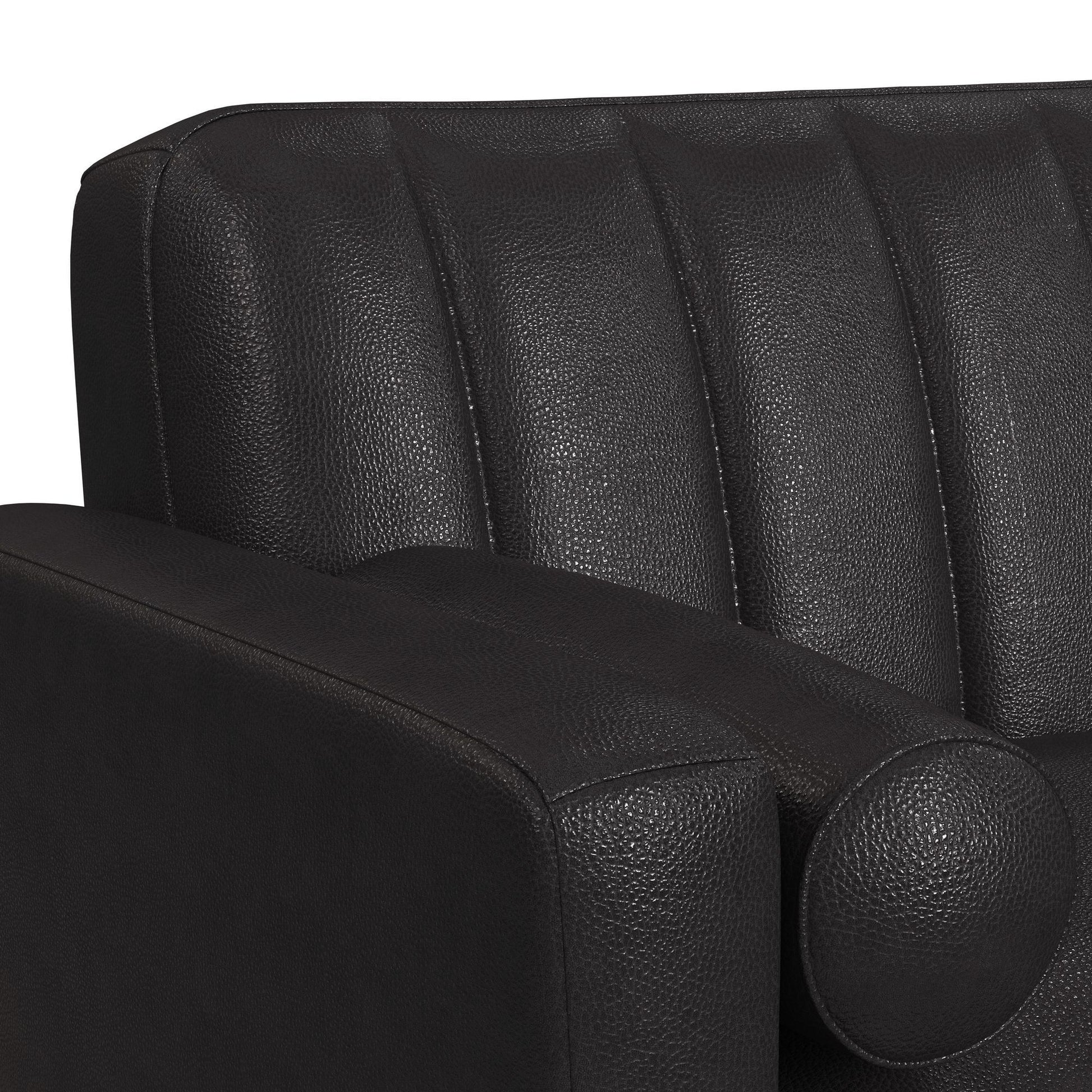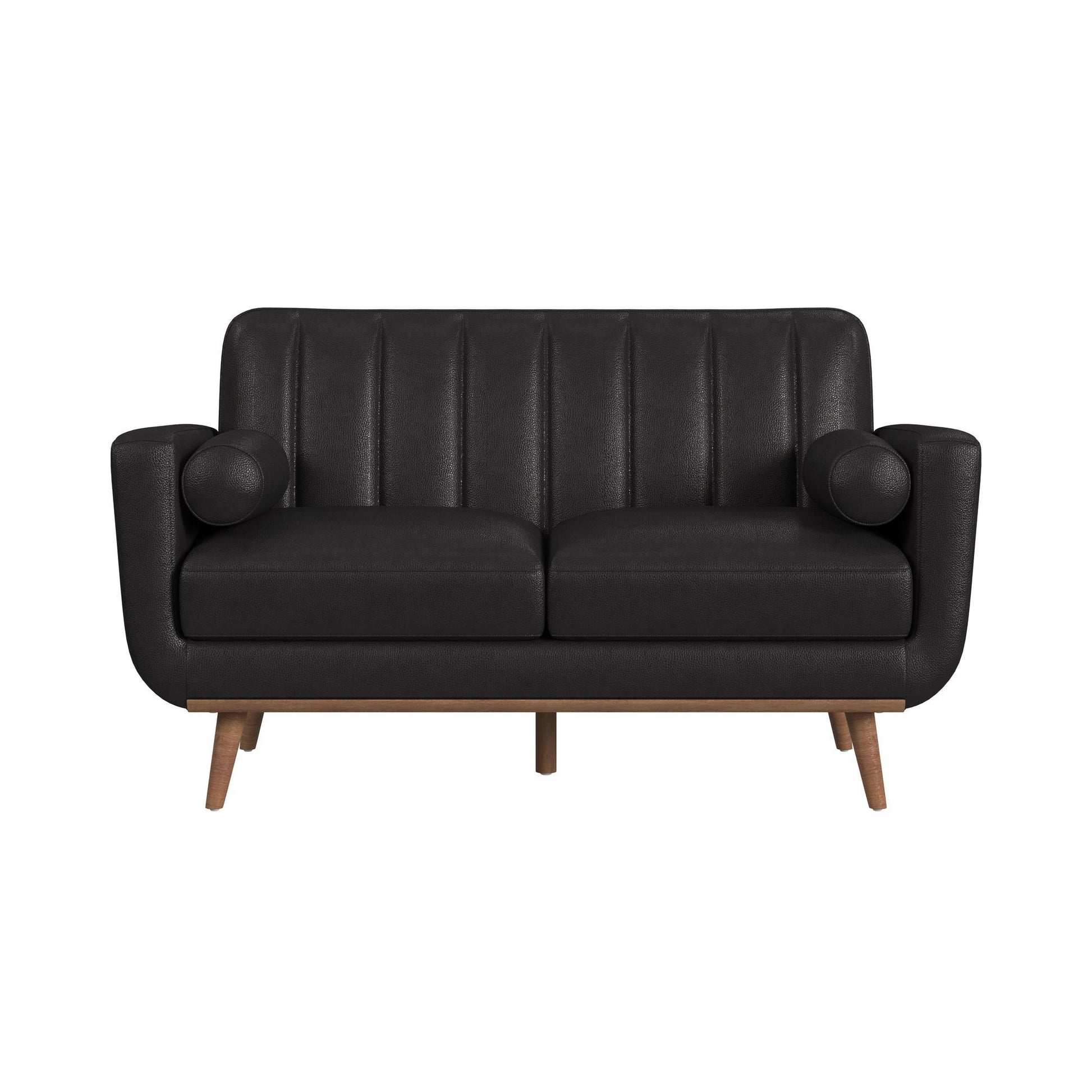 The Horizon Loveseat with Wood Front and 2 Six Inch Bolster Pillows exudes the coveted charm of mid-century modern style. Built with a frame fully upholstered in quality faux leather, this piece is built for durability. Comfortable foam cushioning, decorative tufting on the backrest, and track arms forming sleek and modern lines culminate to mark thoughtful design, while an exposed front rail and wood legs highlight excellent craftsmanship. For a refined and sleek addition to your living space, the Horizon Loveseat with Wood Front delivers in quality and style.
