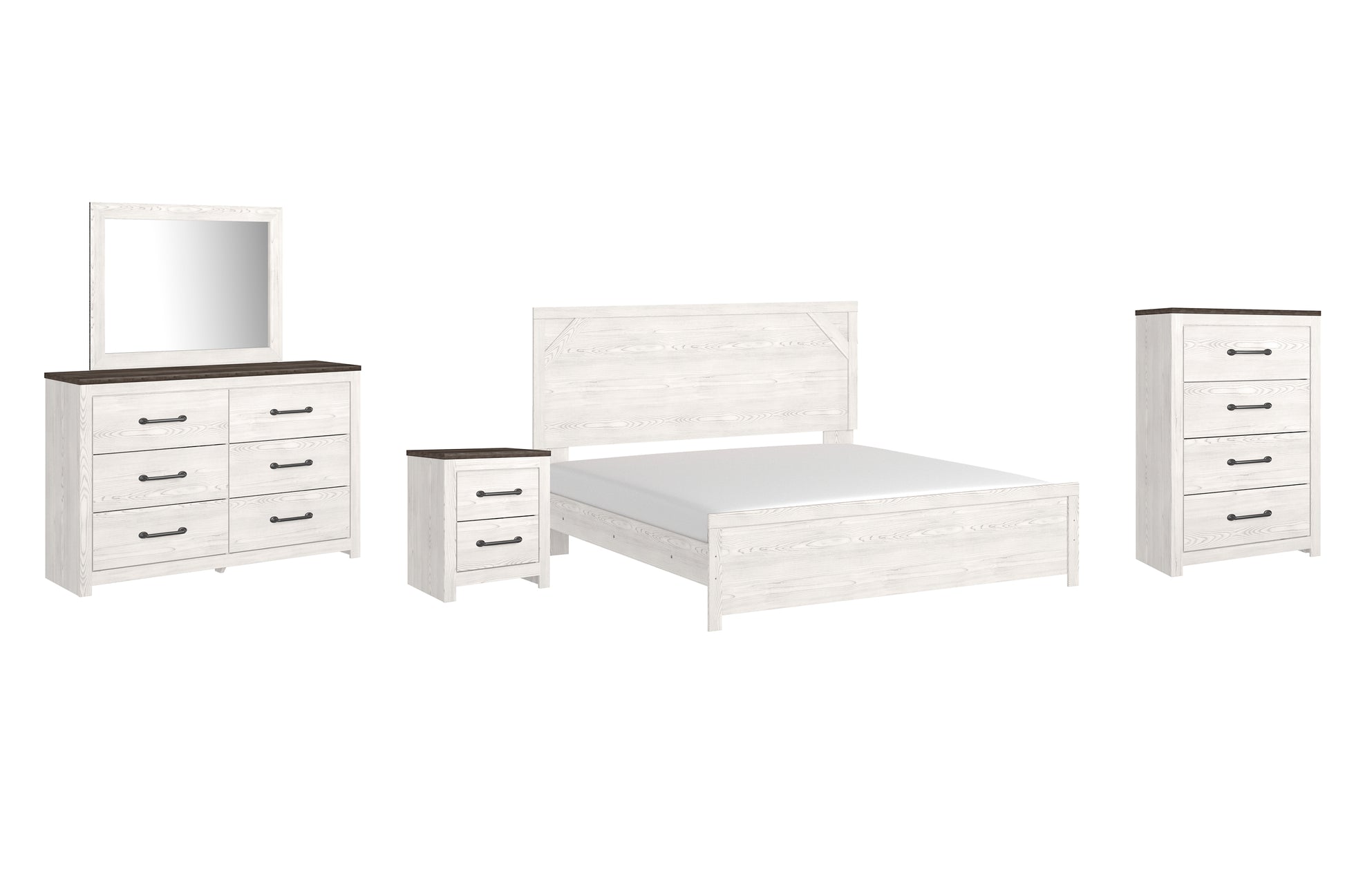 Graystorm King Panel Bed with Mirrored Dresser and Chest