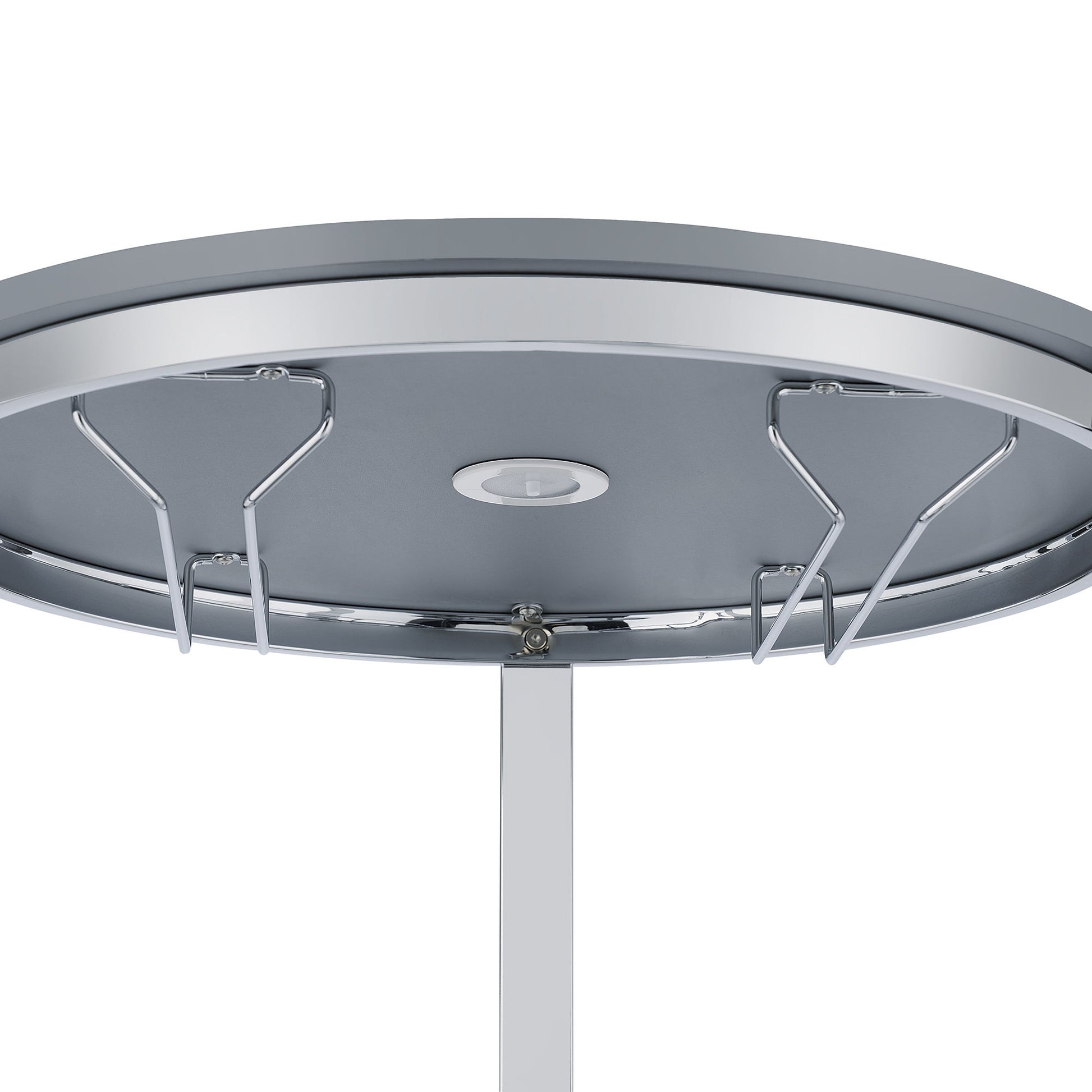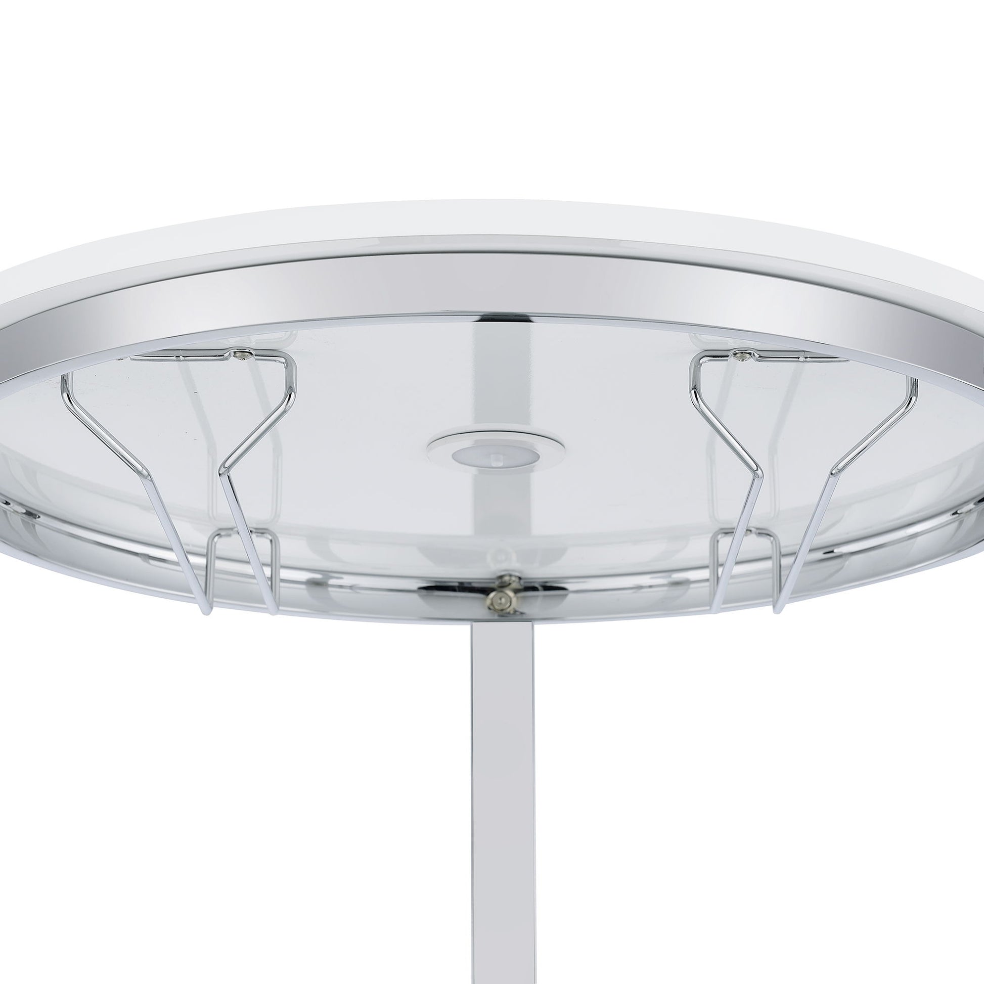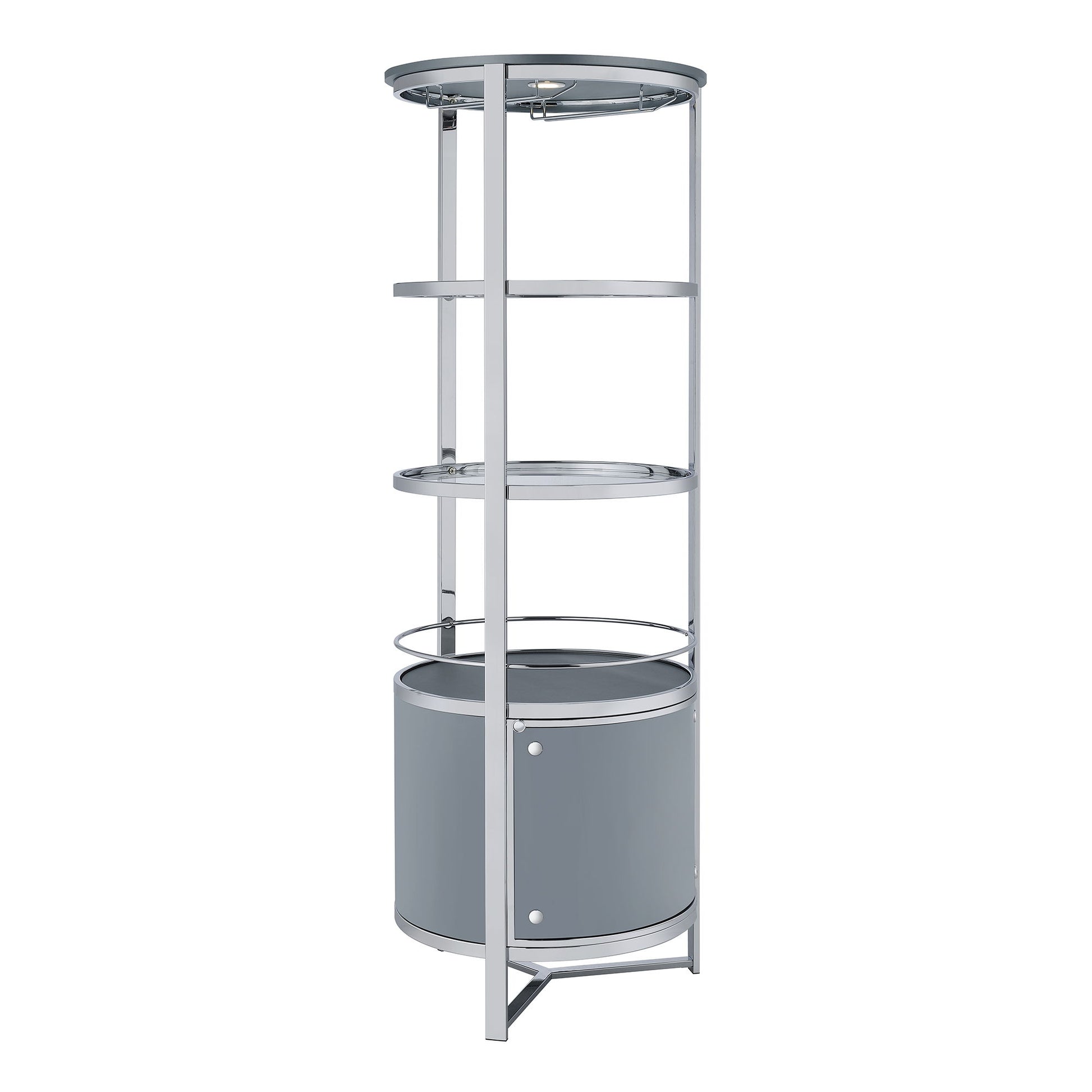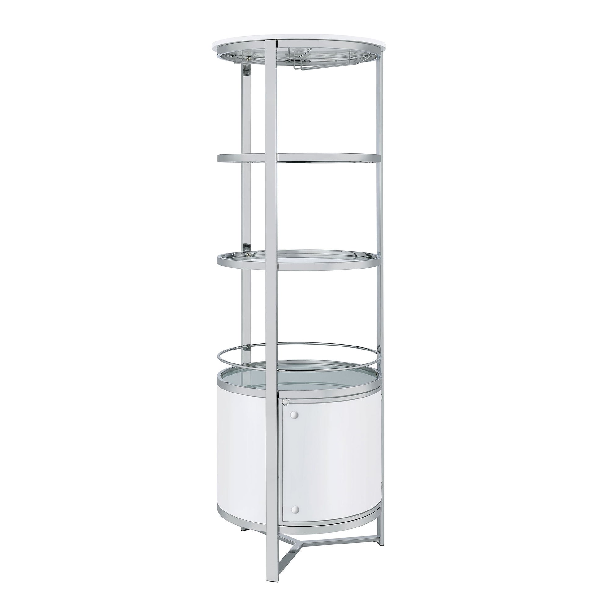 The Lalia Wine Rack with LED accents your dining space with modern style. The multiple open glass shelves allow you to decorate this piece to perfectly suit your home decor, perfectly complementing hidden storage in the bottom cabinet. Two wine glass holders and a convenient LED light adorn the top shelf, while the sleek, chrome finish of the cylindrical frame adds unique, eye-catching style. For a refined, stylish, and thoughtfully designed addition to your dining area, the Lalia Wine Rack with LED delivers.