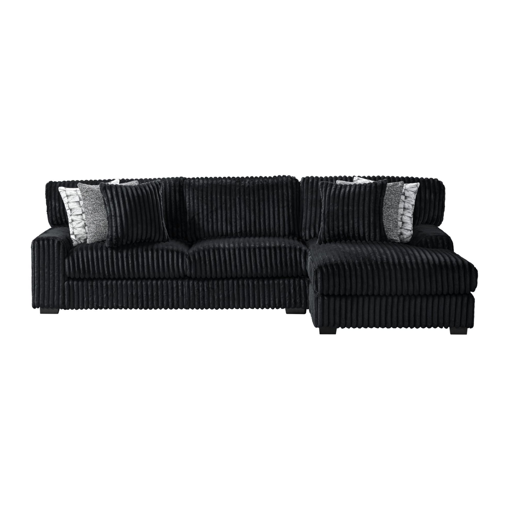 Outfit your home with the refined style of the Nightfall 2-Piece Sectional in Grand Cord Black. Built for lasting comfort, this piece features durable, 100% polyester upholstery and supportive foam cushioning. The sleek, black finish complements a variety of décor styles, while the included accent pillows enhance visual appeal. Sleek track arms form a timeless profile, and the sturdy block feet create a reliably stable foundation. For a stylishly practical addition to your living space, the Nightfall 2-Piece Sectional delivers.