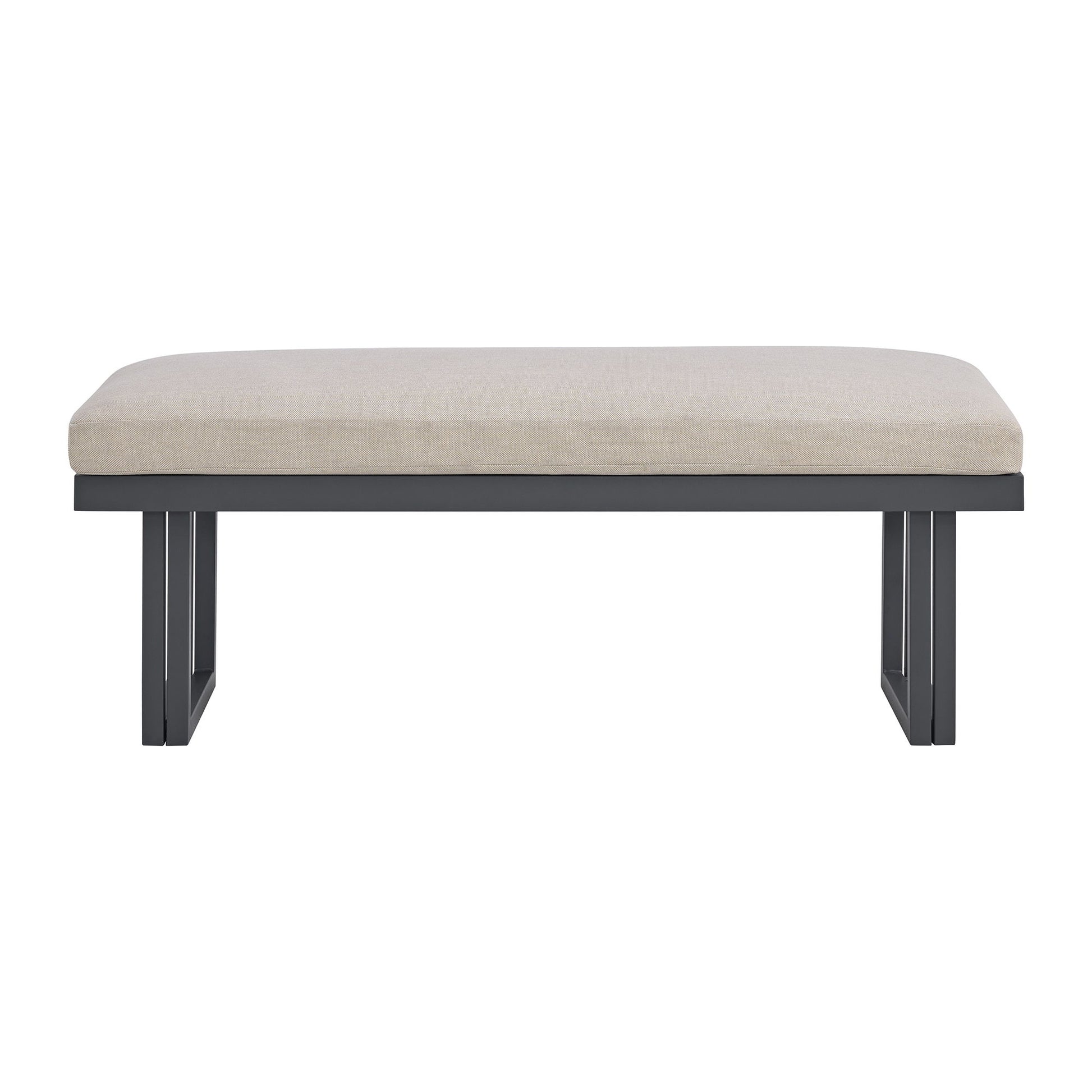 Relax in the sleek simplicity of the Playa Dining Bench. Built with durability in mind, this piece features quality materials optimal for outdoor use, like aluminum framing and weather-resistant olefin upholstery. A detachable seat cushion with memory foam eases maintenance while simultaneously forming clean lines with its streamlined knife-edges. The angular open base creates a refined, modern look and reinforces the piece’s structure without sacrificing style. For a clean and refined update to your outdoor area, the Playa Dining Bench delivers in both durability and style.