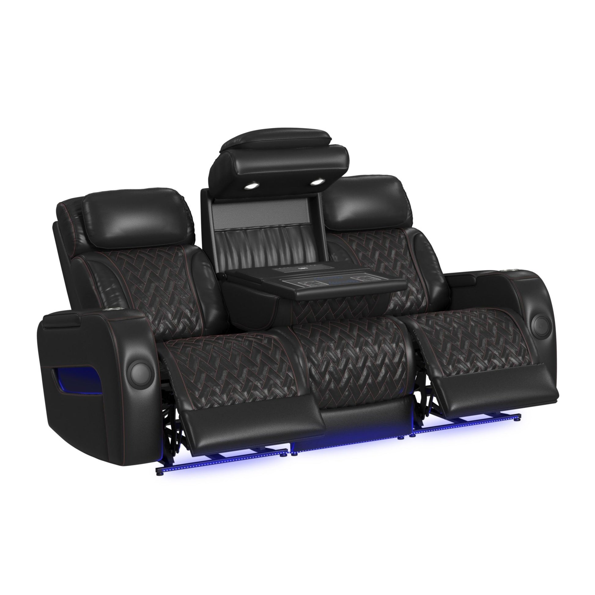 Upgrade your living room’s décor with the Prime Time Sofa. The power recline, headrest, and lumbar functions maximize comfort, allowing you to enhance your moments of repose. Features like LED lighting and a drop-down table with reading lights add modern flair, while wireless charging, metal cupholders, and hidden storage in the armrests add practical convenience. Luxurious 100% leather upholstery in a versatile black finish makes this piece easy to pair with various décor styles, and supportive pocket coil seating with foam cushioning creates a cozy retreat. For a refined addition of style and comfort, the Prime Time Sofa delivers.
