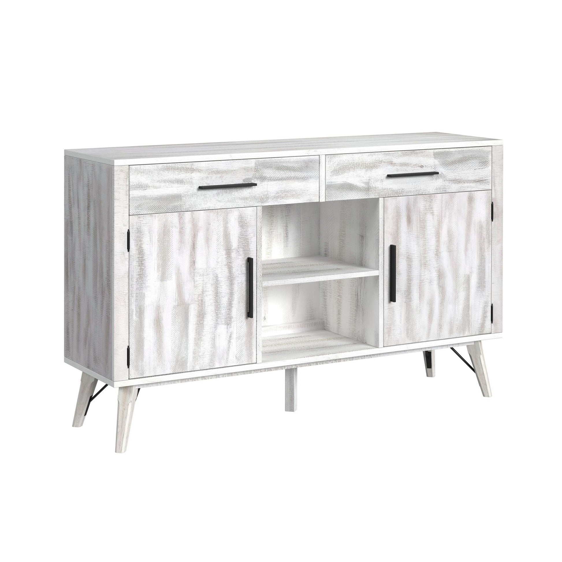 Accent your dining area with the practical style of the Rogen Rustic Buffet. This piece is made with a quality acacia veneer implemented for style and durability. Two drawers with skillful English dovetailing and smooth ball bearing glides perfectly complement the two cabinets and open shelving, providing you ample storage and display options. Tall, tapered feet elevate the piece off the floor, simplifying maintenance and enhancing visual appeal. For an understated yet refined addition to your dining area, the Rogen Rustic Buffet delivers in quality and style.