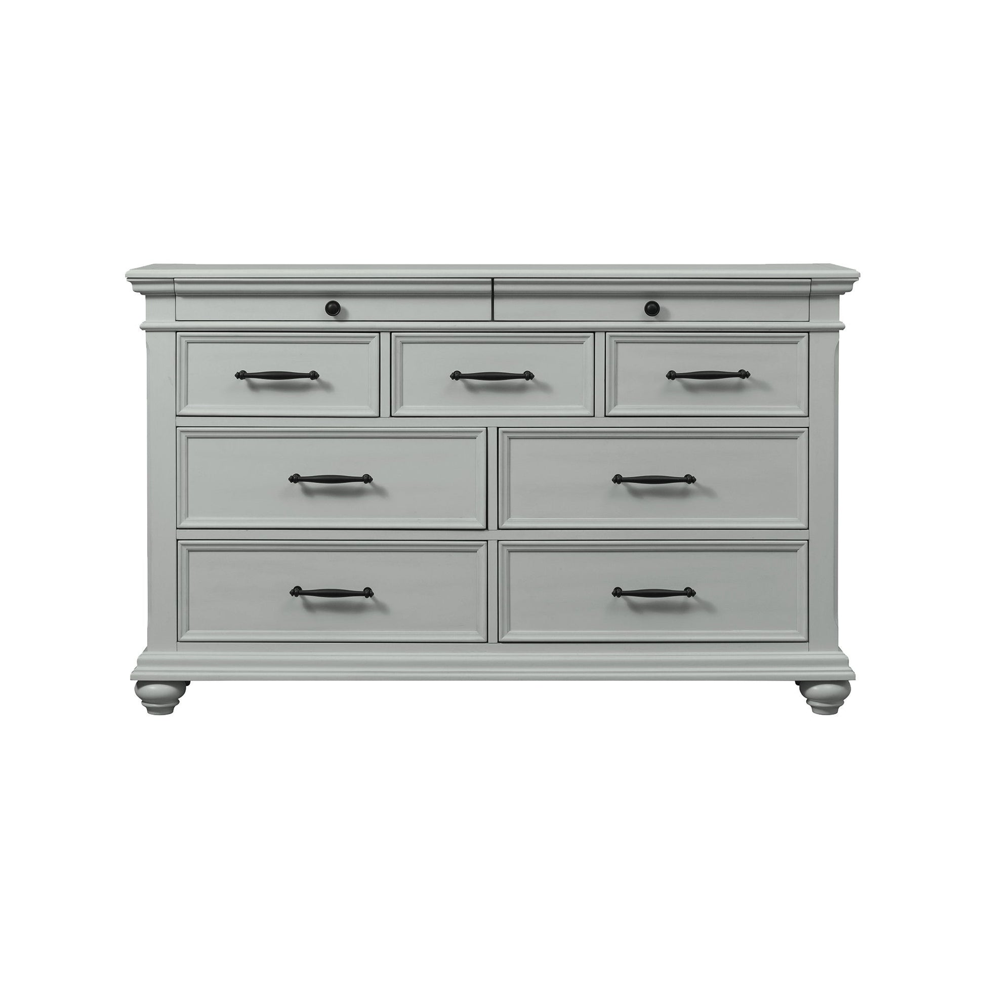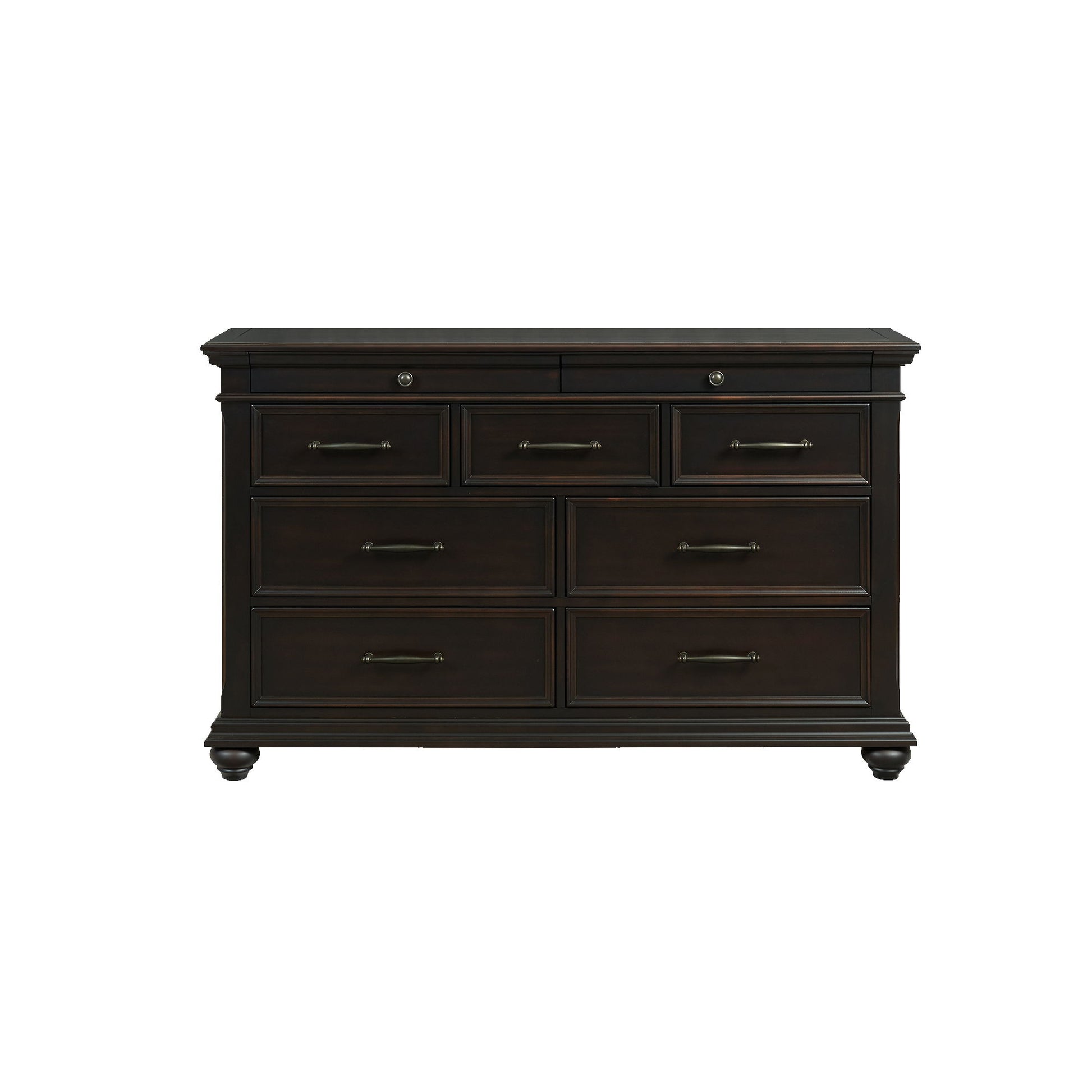 The Slater 9-Drawer Dresser is going to look amazing in your bedroom! This horizontal dressers offers nine spacious drawers for storage; while the top drawers features felt lining for you to easily store away your more delicate belongings. The dark metal drawer hardware beautifully pairs with the finish, making it a gorgeous combo that will never go out of style. Bevel edges and bun feet complete the look of this transitional style dresser. Add this piece to your home today for a look that youll enjoy day after day!