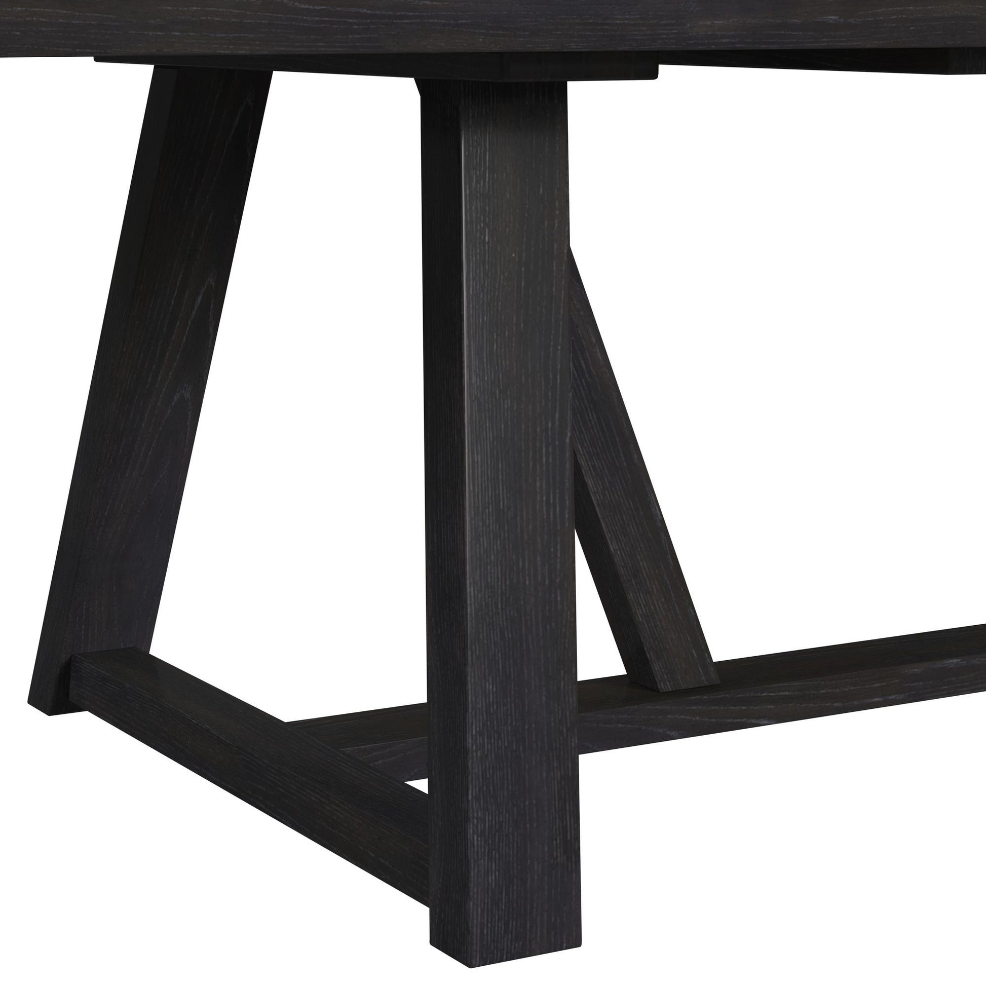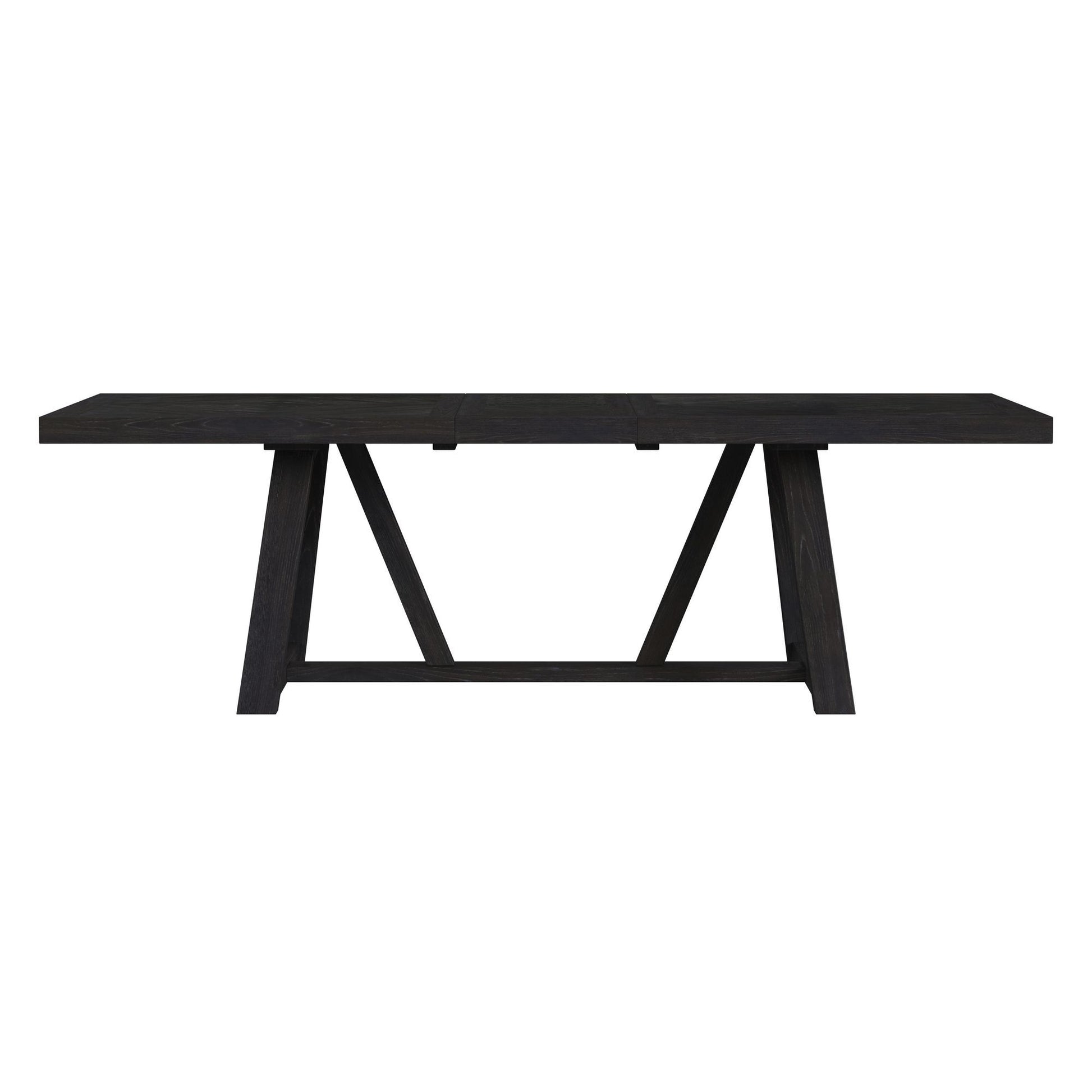 The Transcend Dining Table brings modern elegance and functionality to your home. Rich charcoal tones beautifully highlight the intricate woodgrain, adding warmth and depth to your dining space. The tabletop features exquisite chevron and herringbone patterns, creating a unique, eye-catching surface that elevates the room’s aesthetic. Its geometric angular base adds a bold and stylish statement, while the wood frame with an oak veneer ensures durability and showcases a stunning natural grain finish. With a 22" removable leaf, the table expands effortlessly, providing extra seating and serving space for family gatherings or special occasions. Elevate your dining experience with the Transcend Dining Table.